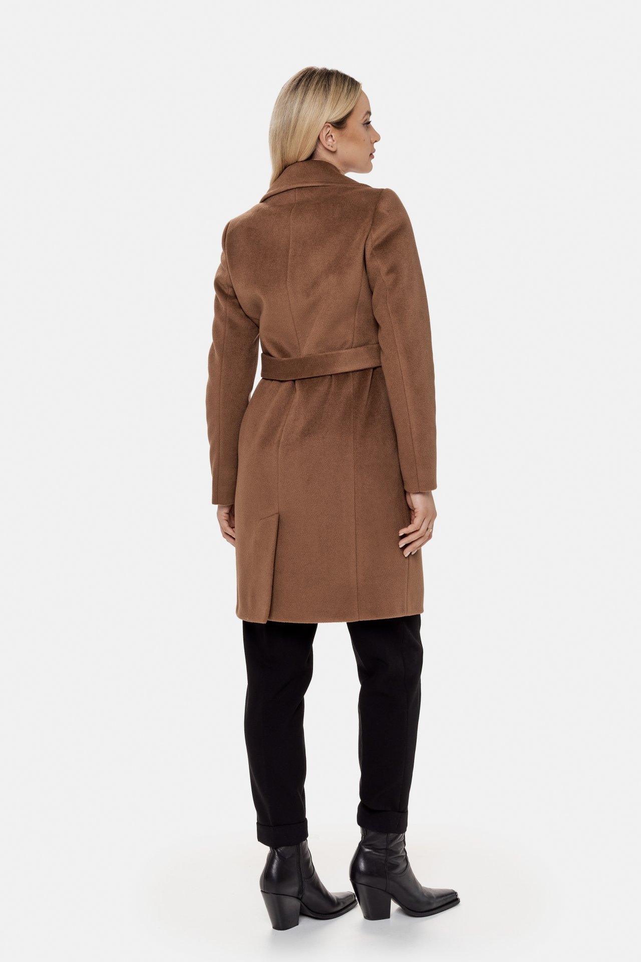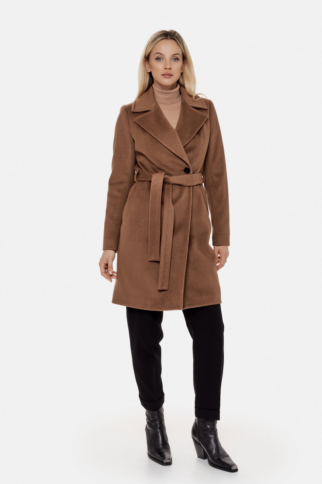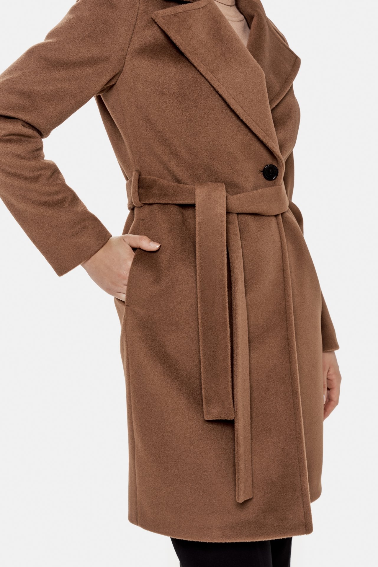 Zimowy, krótki płaszcz z kołnierzem i klapami. Idealny do samochodu. Zapinany na guziki i regulowany w talii paskiem.