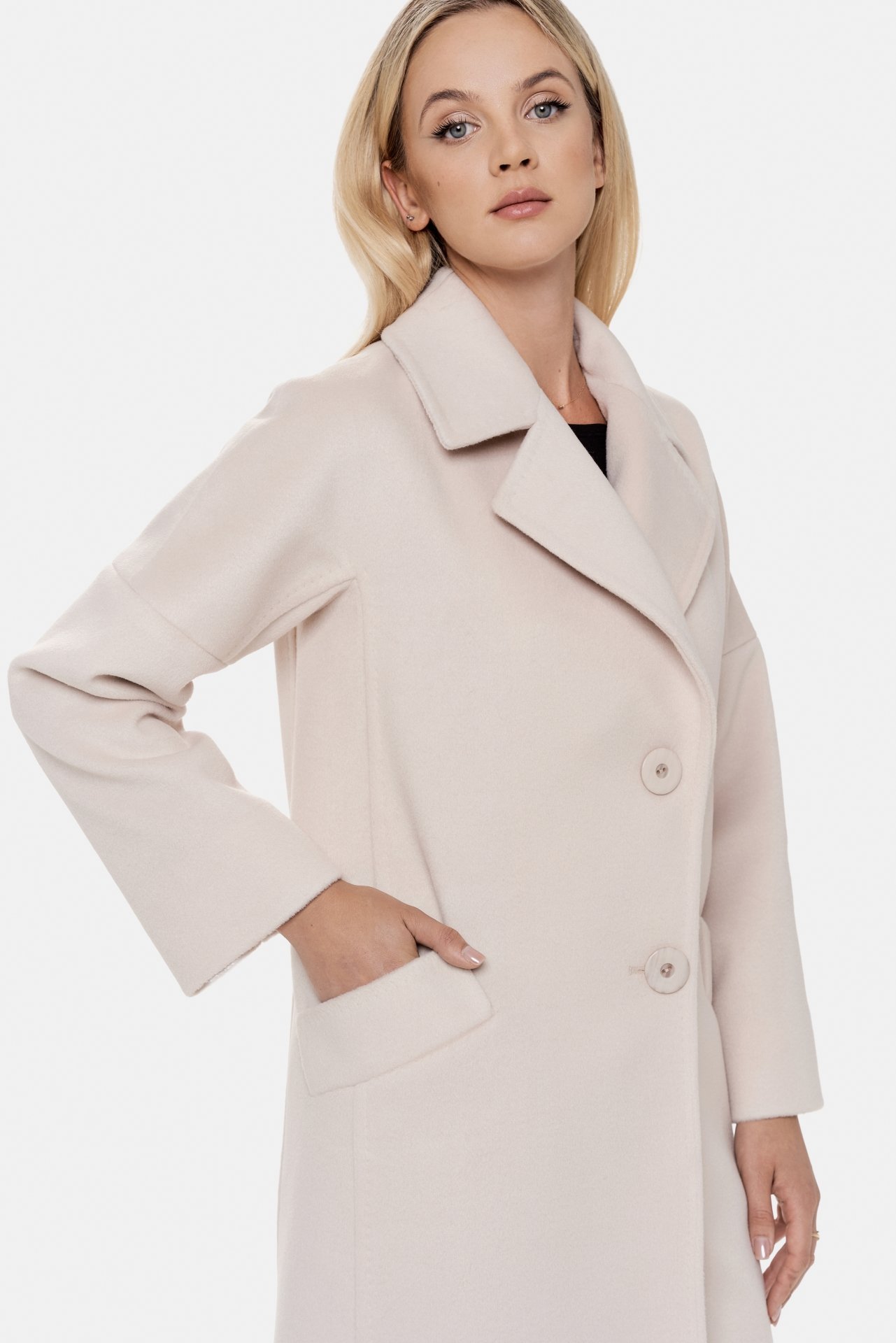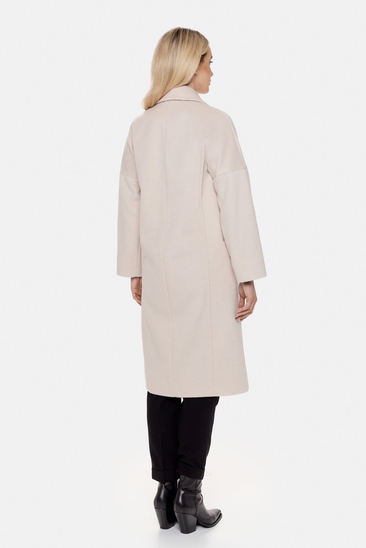 Elegancki długi płaszcz wykończony kolorową podszewką, bez ocieplacza. Model pudełkowy o prostym fasonie z opuszczoną linią ramion. Długość płaszcza 108 cm.