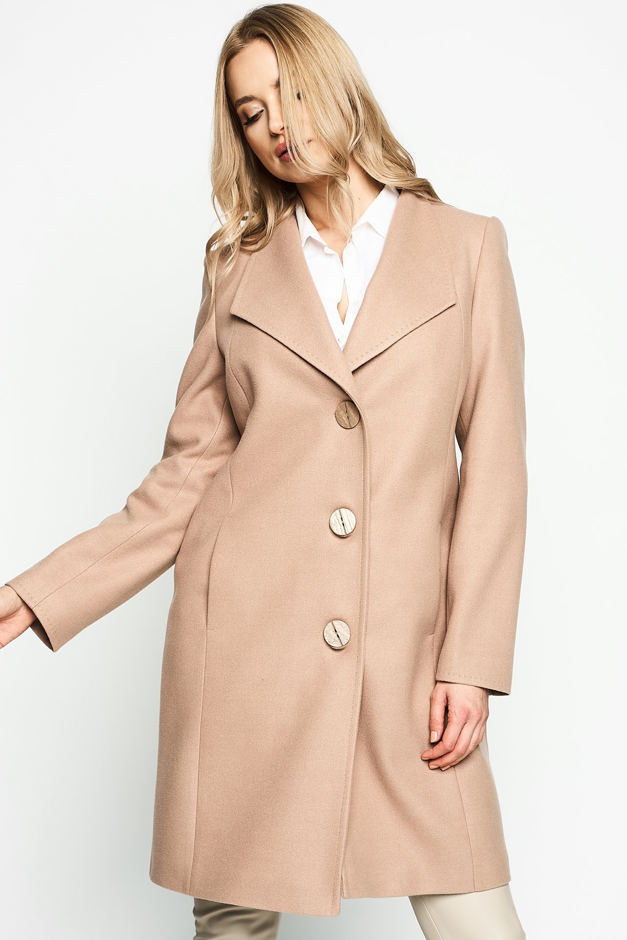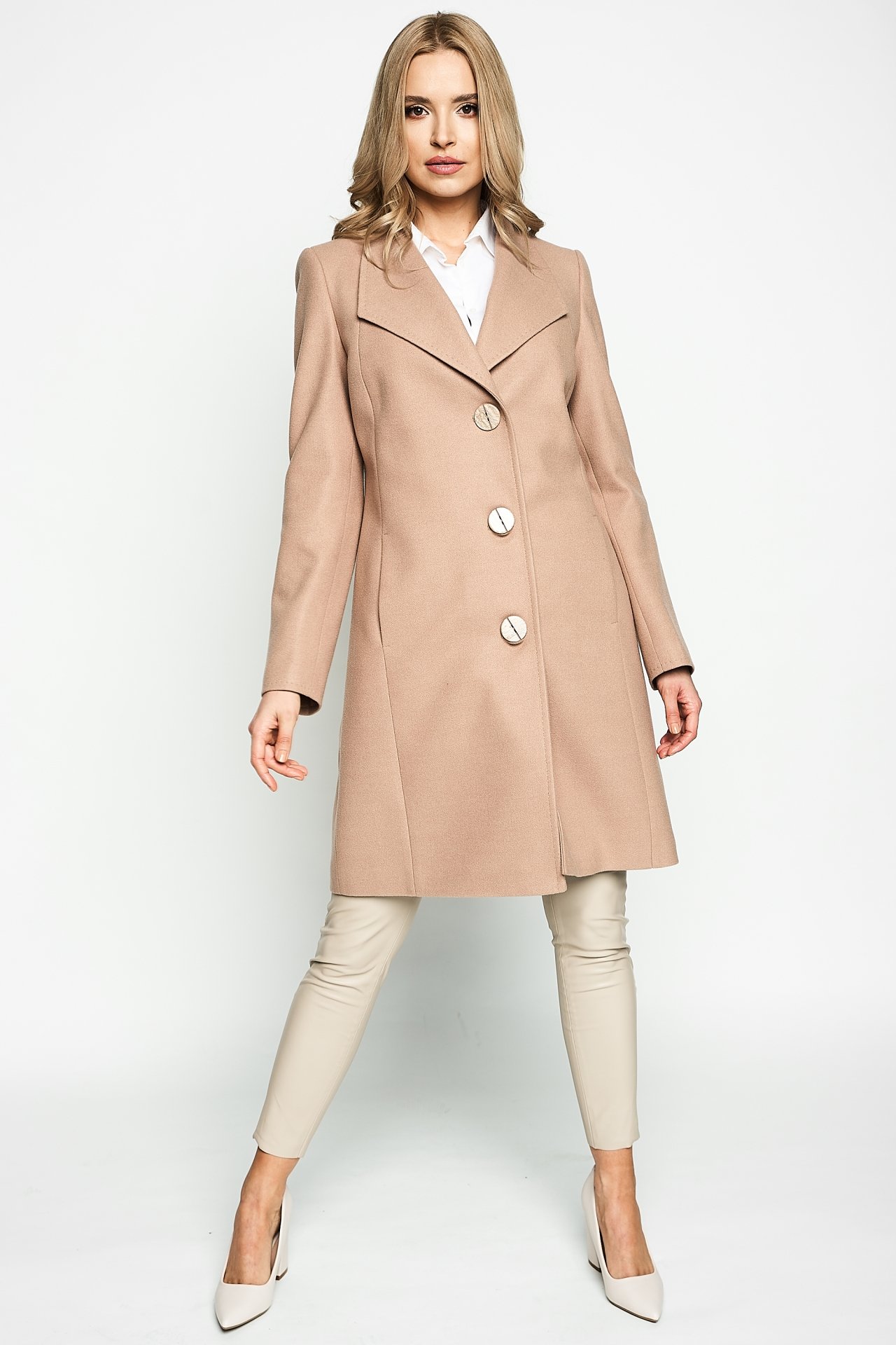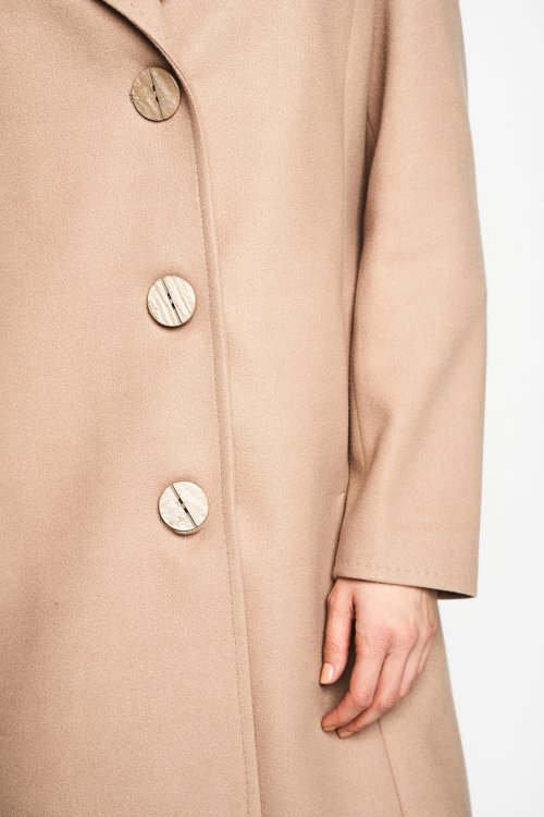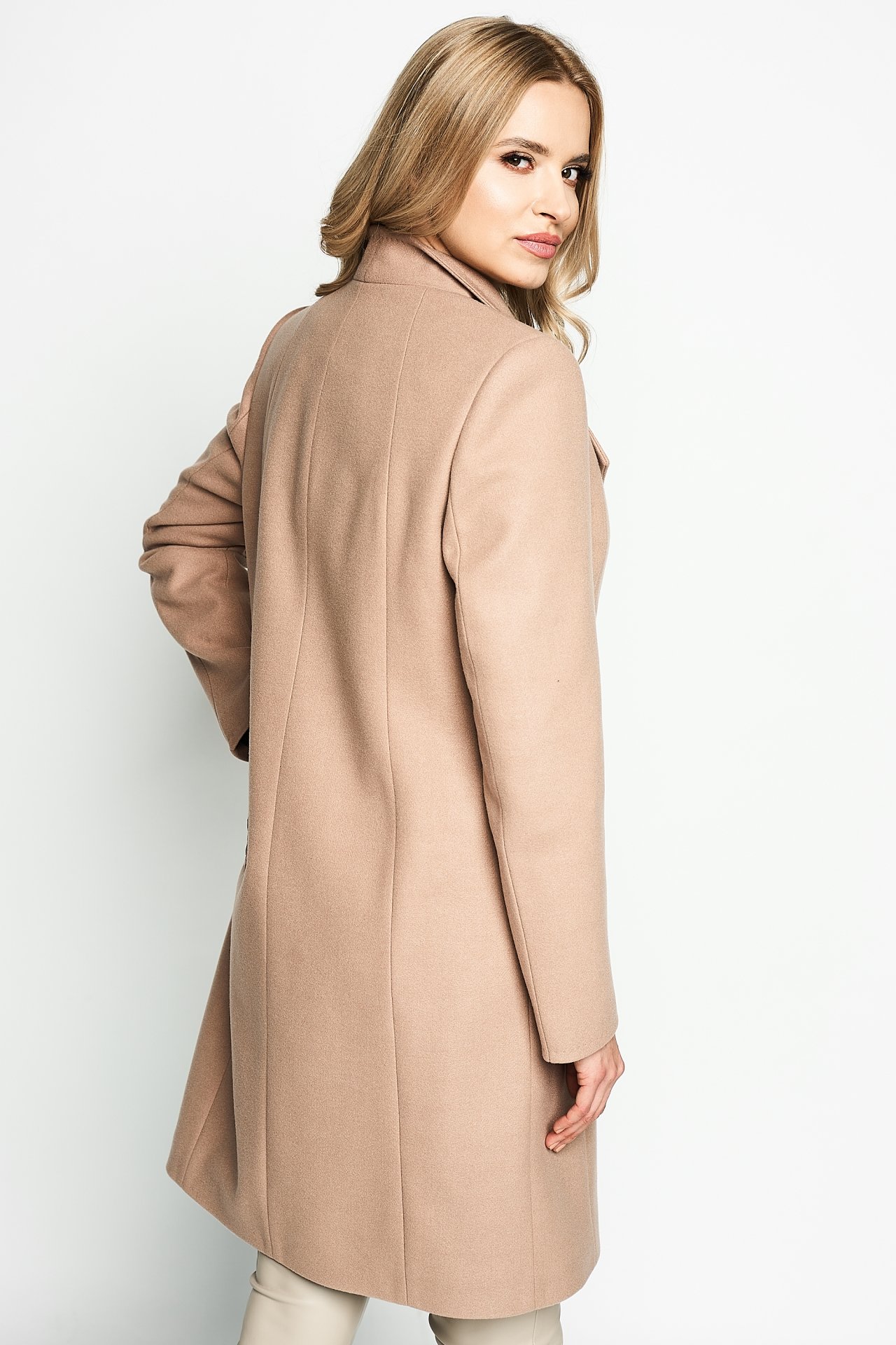 Płaszcz przejściowy Aga z kołnierzem typu stójka, zapinany na trzy ozdobne guziki. Boczne kieszenie, bez rozcięcia z tyłu.