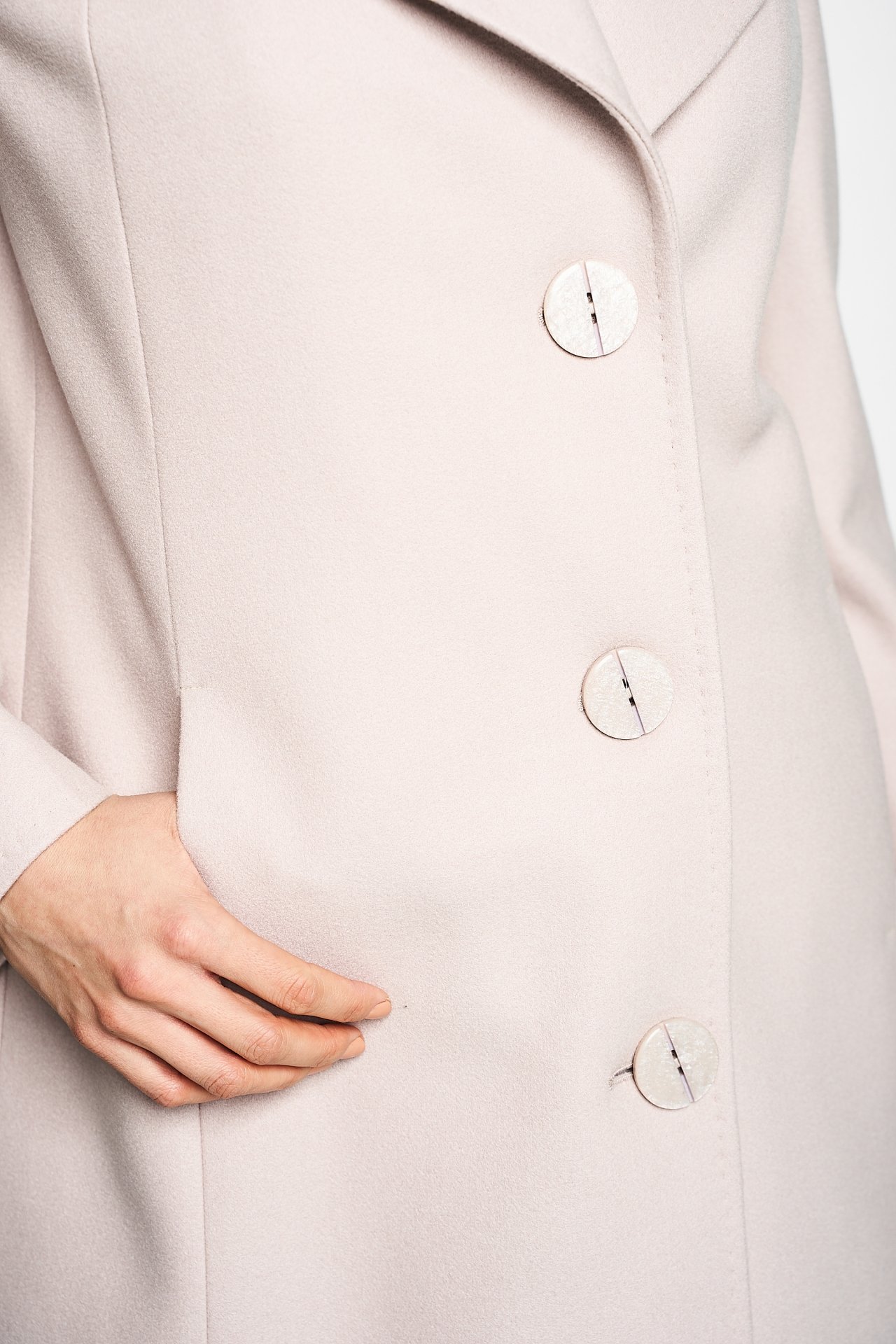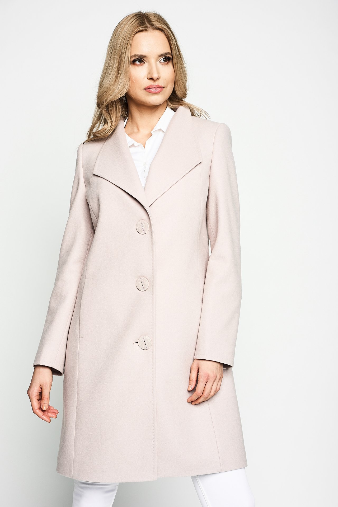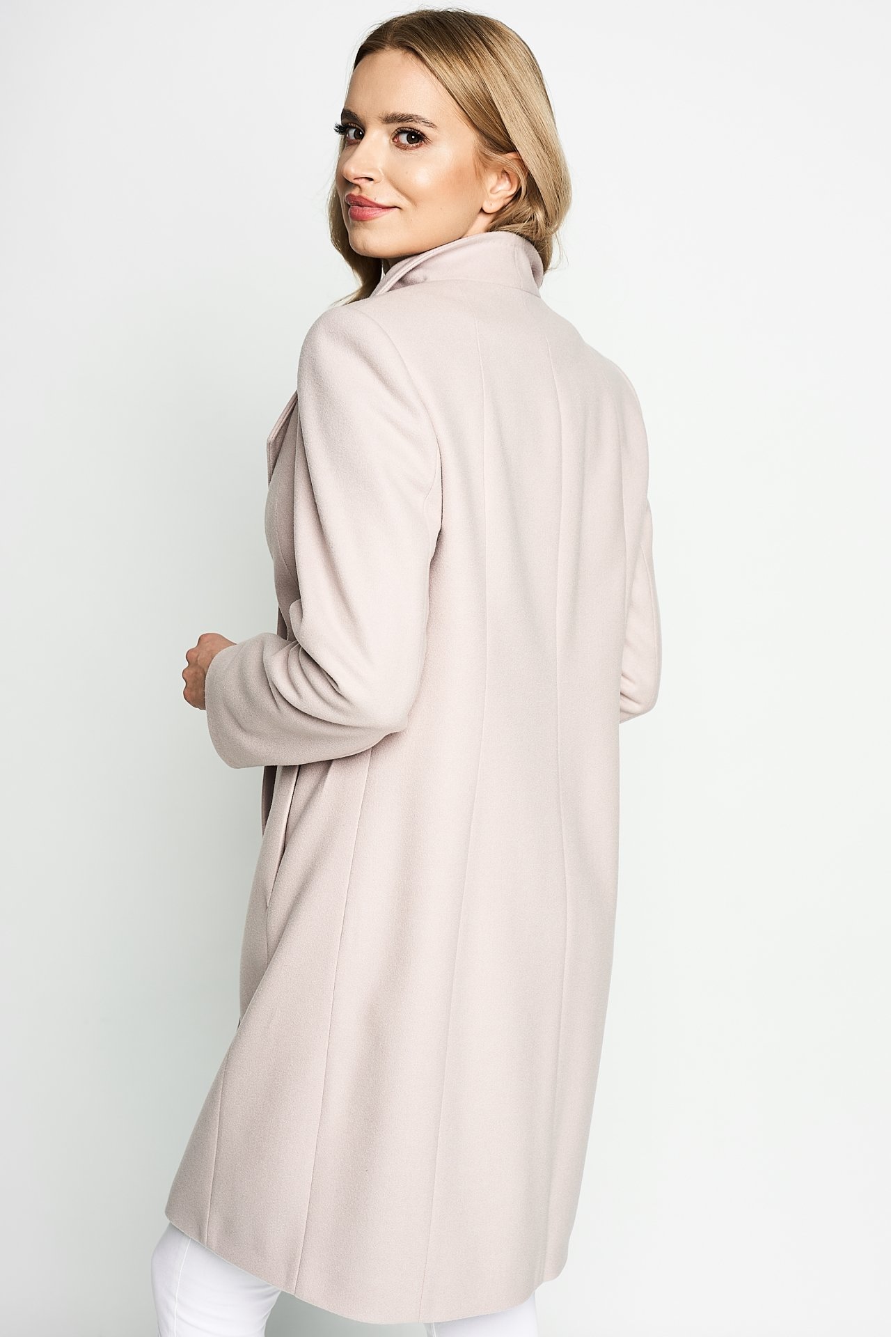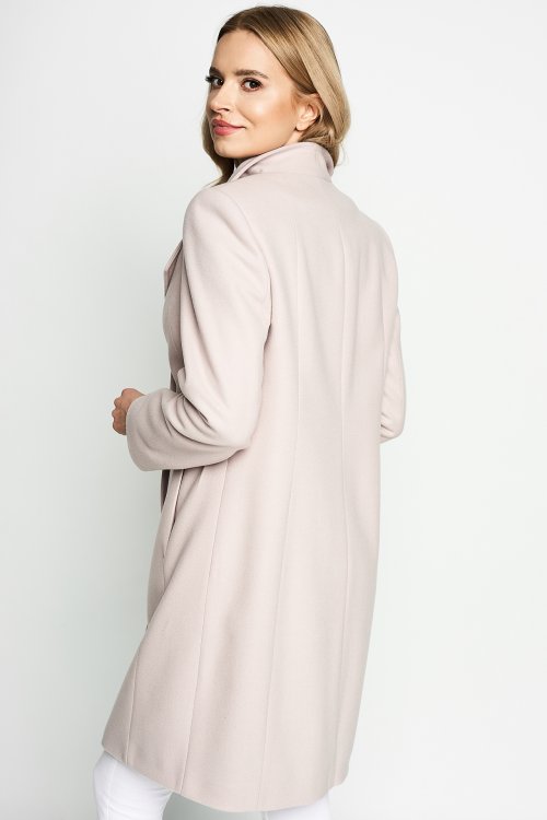 Płaszcz przejściowy Aga z kołnierzem typu stójka, zapinany na trzy ozdobne guziki. Boczne kieszenie, bez rozcięcia z tyłu.