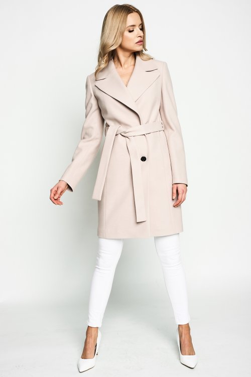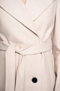 Płaszcz przejściowy Gabi, idealny na wiosnę i jesień. Zapinany na dwa guziki i wiązany w talii paskiem. Z tyłu płaszcza rozcięcie, a po bokach kryte kieszenie.