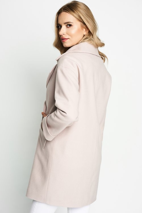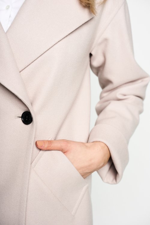 Płaszcz wiosenno-jesienny LIZA. Model typu oversize z rozłożystymi klapami i podwijanymi rękawami. Zapinany na dwa guziki, dwurzędówka. Krótki, idealny do samochodu.